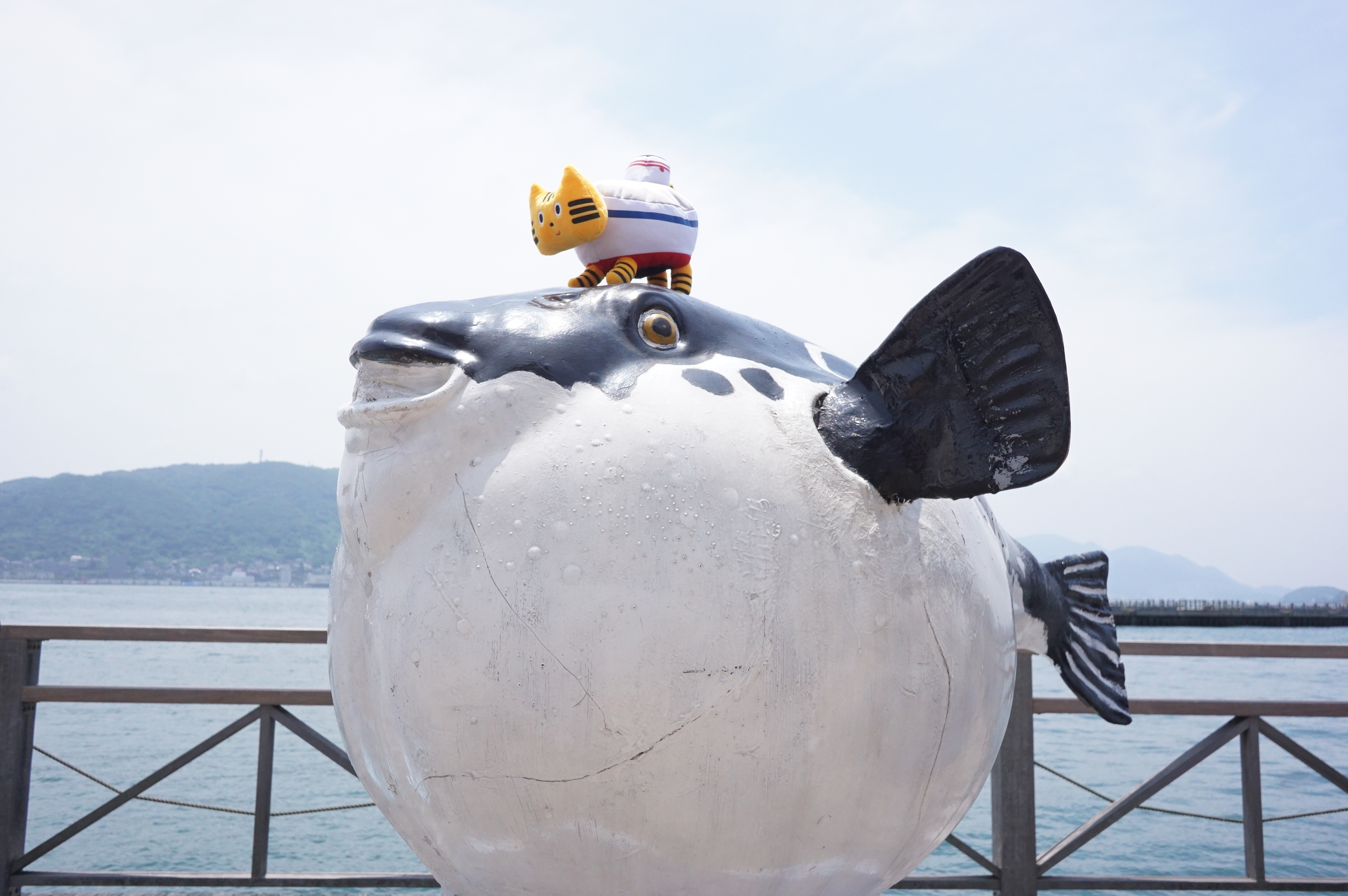 下関ではお友達(!?)のフグくんが「ふねこ、よく来たね〜」と歓迎ムード。ふねこも尻尾をピンとまっすぐ立てて、フグくんにご挨拶。さてさて、下関ではどんなお楽しみが待っているのでしょうか♪
