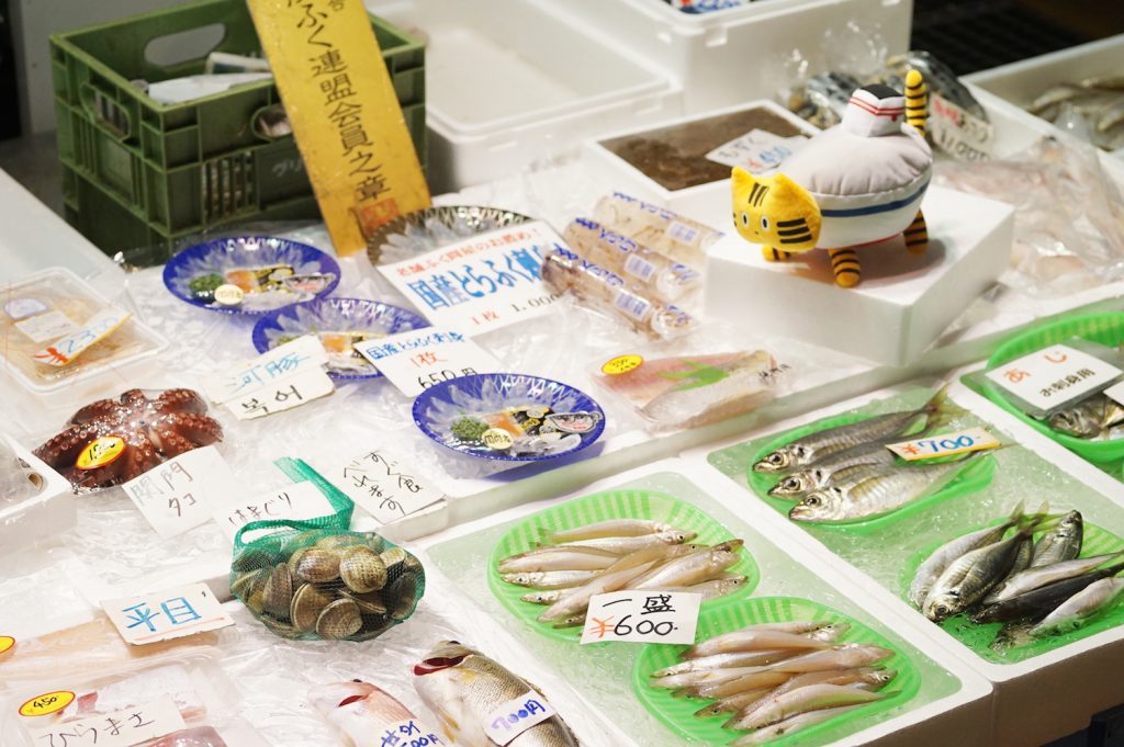 国産とらふくの刺身が650円(※時価)から揃うなんてビックリ〜!! 甘鯛やアジ、はまぐりも大きいうえにリーズナブル。思わず凝視しちゃうほど、色もツヤもきれいな魚介類、そして格安な市場価格に驚きを隠せません。