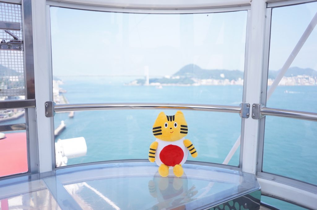 壁も床もスケスケのゴンドラで、なに食わぬ顔をして涼しげなふねこ。関門海峡を優雅に眺めつつ、ゆっくり上へあがっていくにつれ、視界が広がっていくのを実感して感動しているようです。どうやら高所恐怖症ではないようだけど、ふねこ、ホントに大丈夫…!?