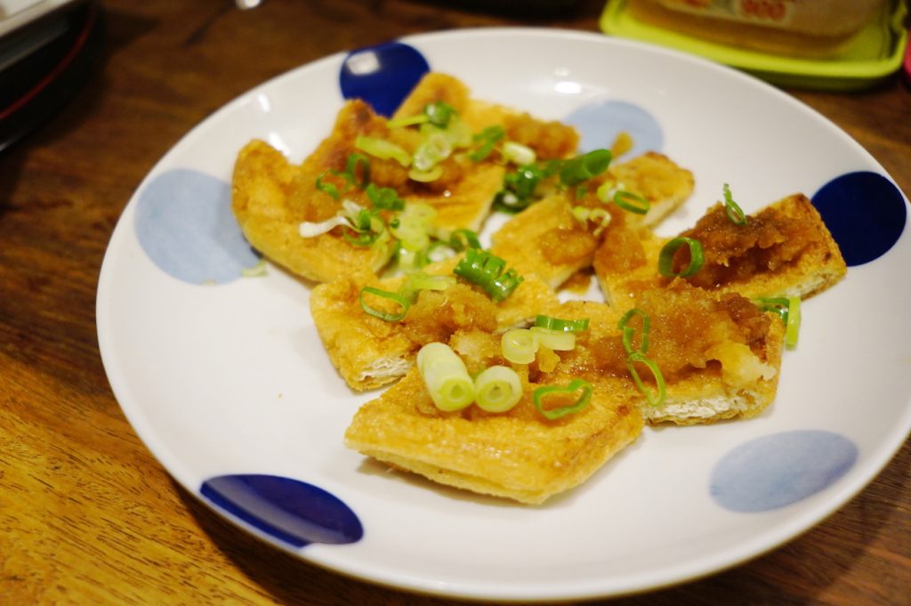 品書きにある「エレベーター」という謎のメニューを発見! オーダーすると、出てきたのは油揚げに大根おろしを乗せたおつまみでした。大将に名前の由来を聞くと、京都には日本最古のエレベーターがあるそうで、それにちなんで「あげ」と「おろし」の「エレベーター」というメニューが誕生したそう。へぇ〜!