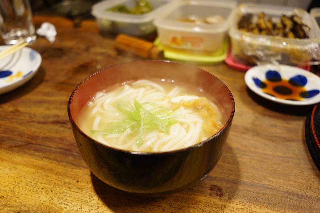 〆のうどんは、昆布と鰹で出汁をとった京都流の優しい味。甘鯛の骨を一緒に煮込んで風味を足したそうで、粋な計らいに心まで温まります。細麺がするっと喉を通り、さっぱりいただけます。大将、ごちそうさまでした!!!