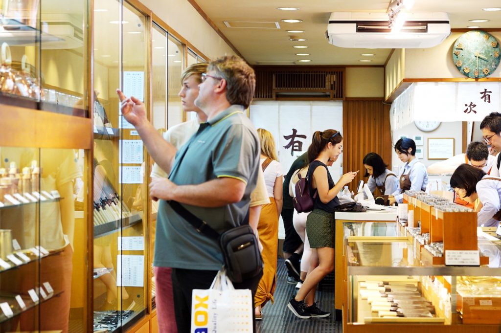 商店街内にある和包丁の名店『有次』は、料理好きにはたまらない聖地。切れ味抜群の和包丁が豊富に揃い、購入後はその場で名入れもしてくれますよ。日本伝統の逸品を目的に、海外のお客さんがいっぱい…!