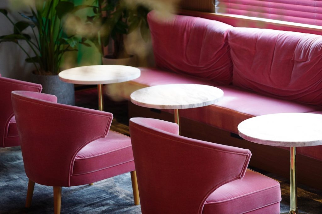 中へ入ると左手にレセプション、奥はラウンジが広がり、無機質なインダストリアル空間にピンクのソファやミラー照明、植物のディスプレーが配され、コンテンポラリーな空間です。