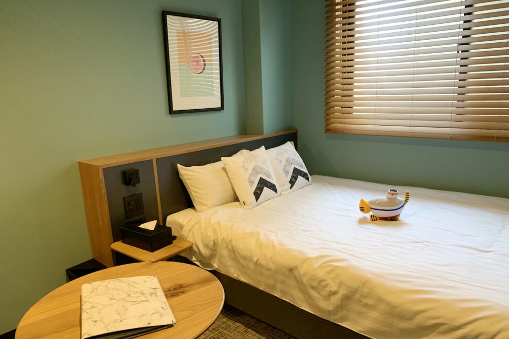 客室はミントグリーンのデザインでとびきりおしゃれ! ダブルルームは1人3,240円から。寝心地のいいシモンズのベッドを導入しているのもポイントで、旅の疲れを癒す快適なお部屋。ツインルームとダブルルームは同じ広さで、スーペリアダブルルームとスーペリアツインルームはキッチン付きの部屋も。自炊できるのでロングステイする出張客や旅行客が多いそうですよ♪