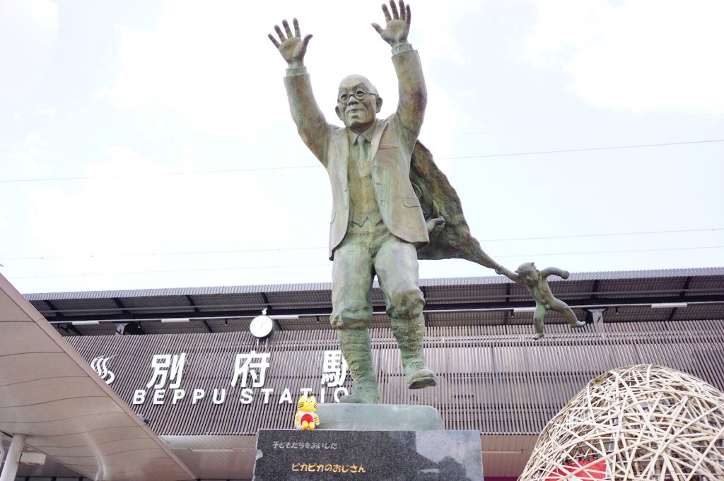 台座には「子どもたちをあいした ピカピカのおじさん」と書かれています。この男性は、今から約90年以上前に別府を日本有数の観光地に押し上げた実業家、「ピカピカおじさん」こと油屋熊八さんです。右下に小さな子供がぶら下がっていてシュールな感じですが(笑)、これは子供好きだった熊八さんの人となりを表したものだとか。