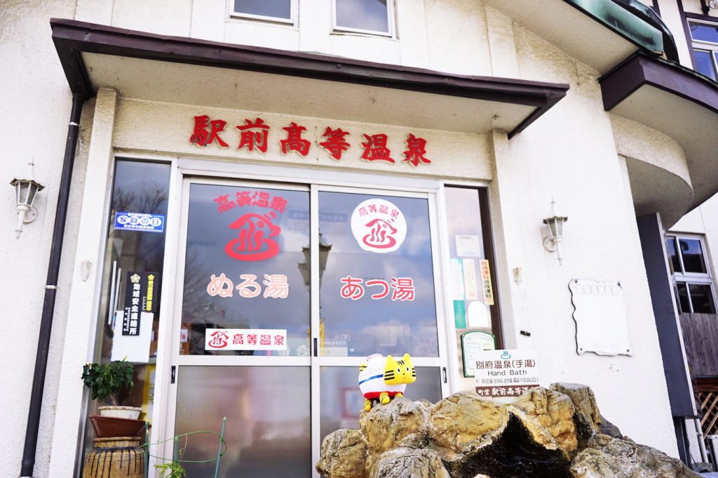 駅の近所にさっそく温泉施設が! 『駅前高等温泉』ではあつ湯とぬる湯が選べるようですね。入り口前に“足湯”ならぬ“手湯”がありましたよ♪