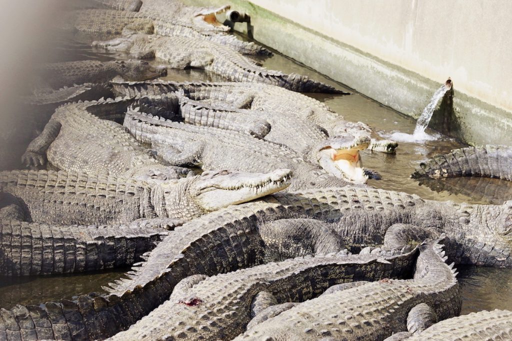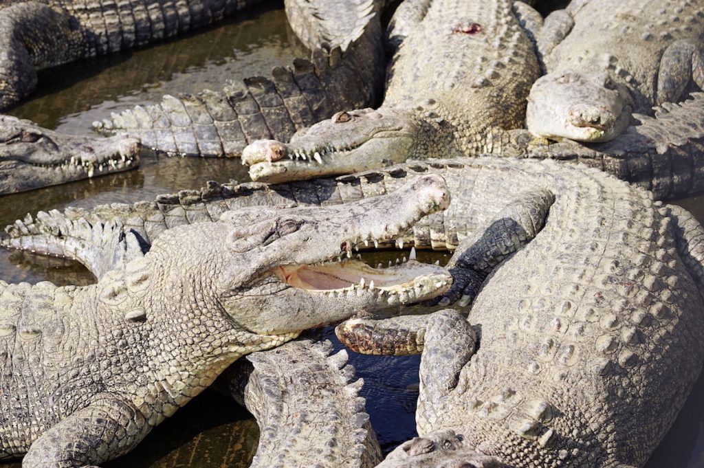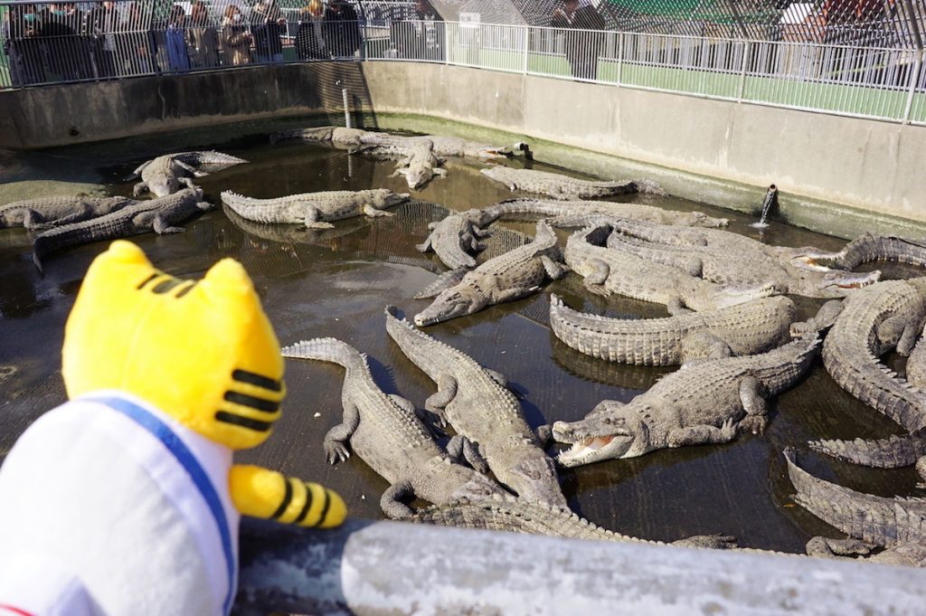 本物のワニが無数に群がっています! クロコダイルやアリゲーターなど、約80頭のワニがふねこを待っていました…!