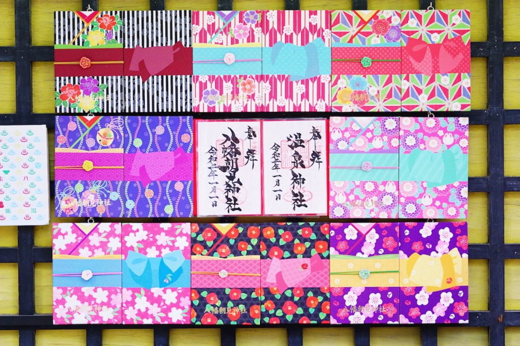 着物モチーフのカラフルな御朱印帳がかわいい♡ 朝見神社と温泉神社の2箇所の御朱印を同時にゲットできるのもうれしい!