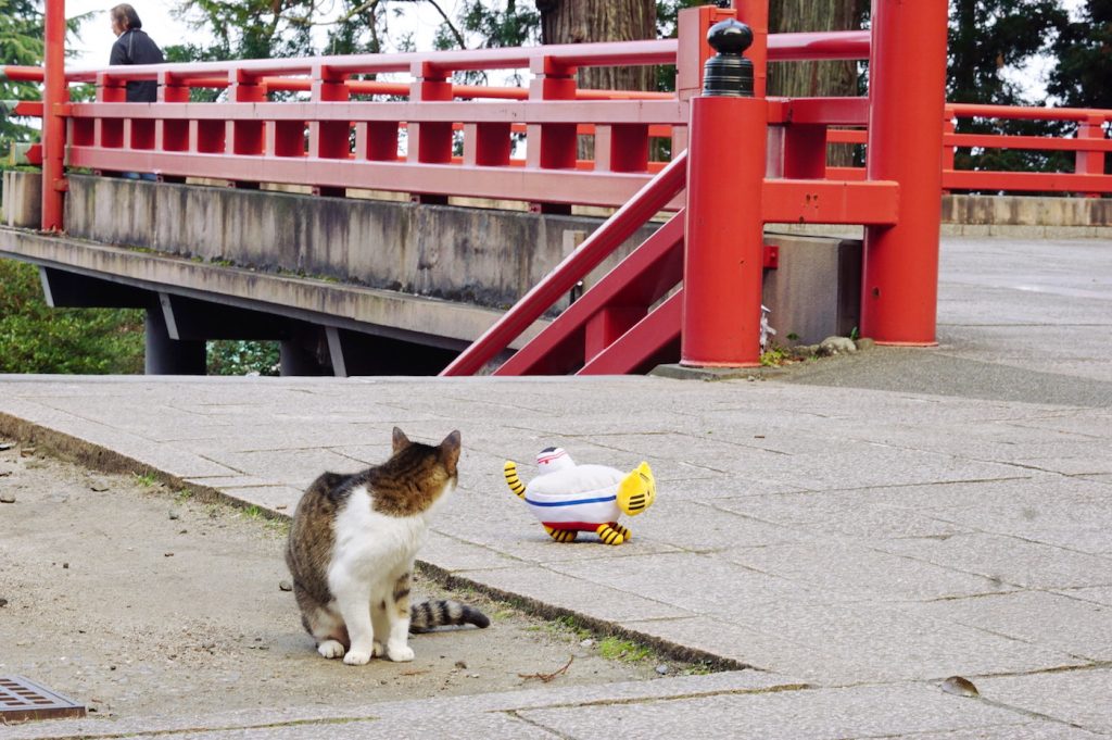 なんだか視線を感じるなと思ったら、じぃ〜っと野良猫さんがこっちを見ていました! 縄張り争いとして牽制しているのか…!? さっきのワニ地獄を思い出したふねこは、争いを避けて駆け足で『温泉神社』を後にしましたとさ♪