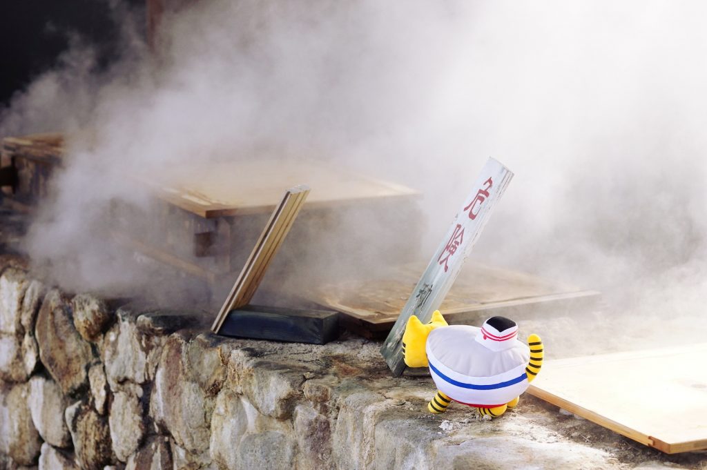 また温泉街を回っていると、こんな光景もよく見かけます。温泉蒸気を利用した地獄釜で、中にはたまごが入っており、その場でほくほくの温泉蒸し卵を食べられるんですよ♪