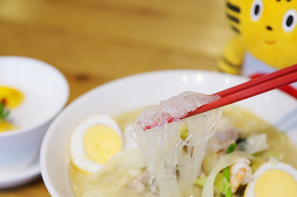 緑豆100%の春雨、鶏ガラと豚骨をブレンドしスープ、本場・福建の天然塩を使用。スープはあっさりとしながらも深いコクが広がり、最後の一滴まで飲み干せるほど五臓六腑に染みわたるおいしさ。揚げ卵を入れることでスープとよく絡み、つるつるの春雨のおかげでさっぱりといただけます。