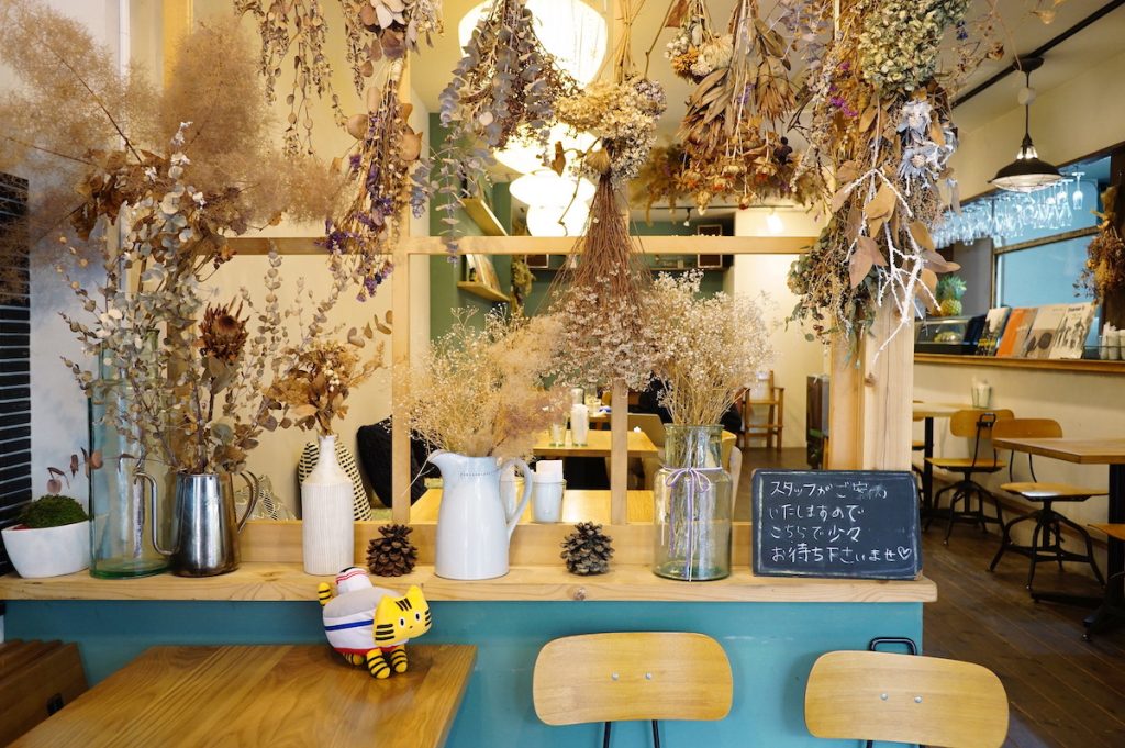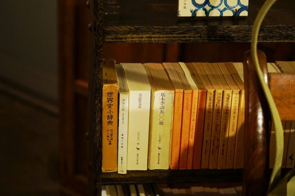 古い木製のテーブルや椅子、そして飾り棚の上には温かみのあるオブジェの数々。これらの骨董品や書物は花人であるオーナーがセレクトしたもので、店内にディスプレイされたアイテムは商品として購入できます。