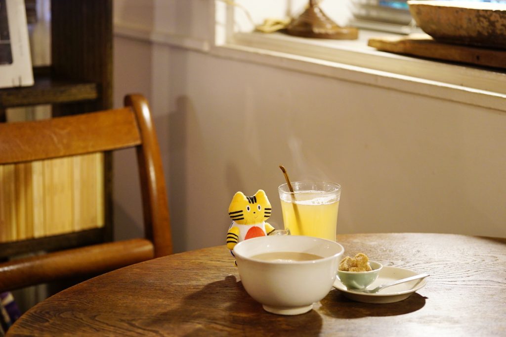 カフェオレボウルにたっぷり注がれたカフェオレと、自家製のレモンジンジャーでふぅっと一息。都会の喧騒を忘れて、古書を手に取って別世界に浸ったり、骨董品から紡がれるストーリーに想いをはせたり…。ここでは携帯電話はしまって、古いものたちが教えてくれる豊かな感性に身を預けるのがよさそう。