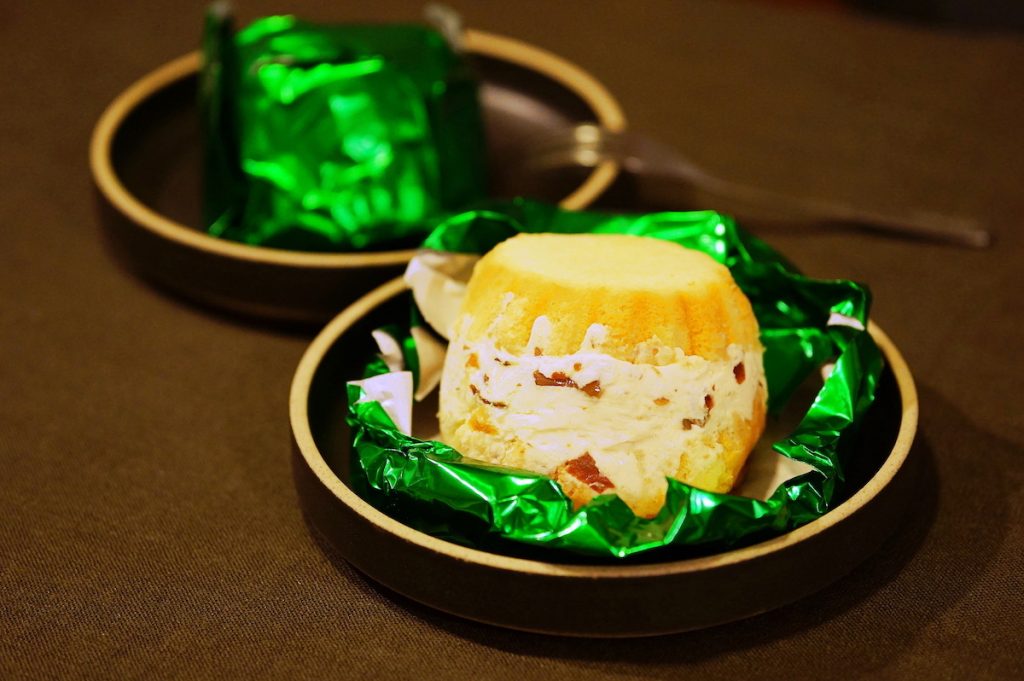 包みを開くと、熊本県産の渋皮マロン入りのバタークリームと、リキュールシロップがたっぷりしみ込んだスポンジを使ったバターケーキがお目見え。創業当時から変わらないレシピで作られているそうで、芳醇な香りとコクが広がる大人の味わいです。