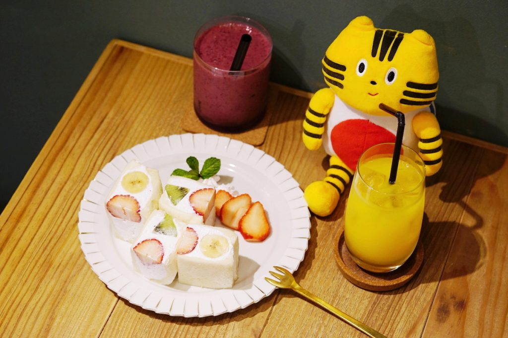 ふねこが頼んだ「ミックスフルーツサンドイッチ」(750円)が到着。カシス&トマトのスムージーとオレンジジュースもオーダーして、ヘルシーにまとめてみました♡