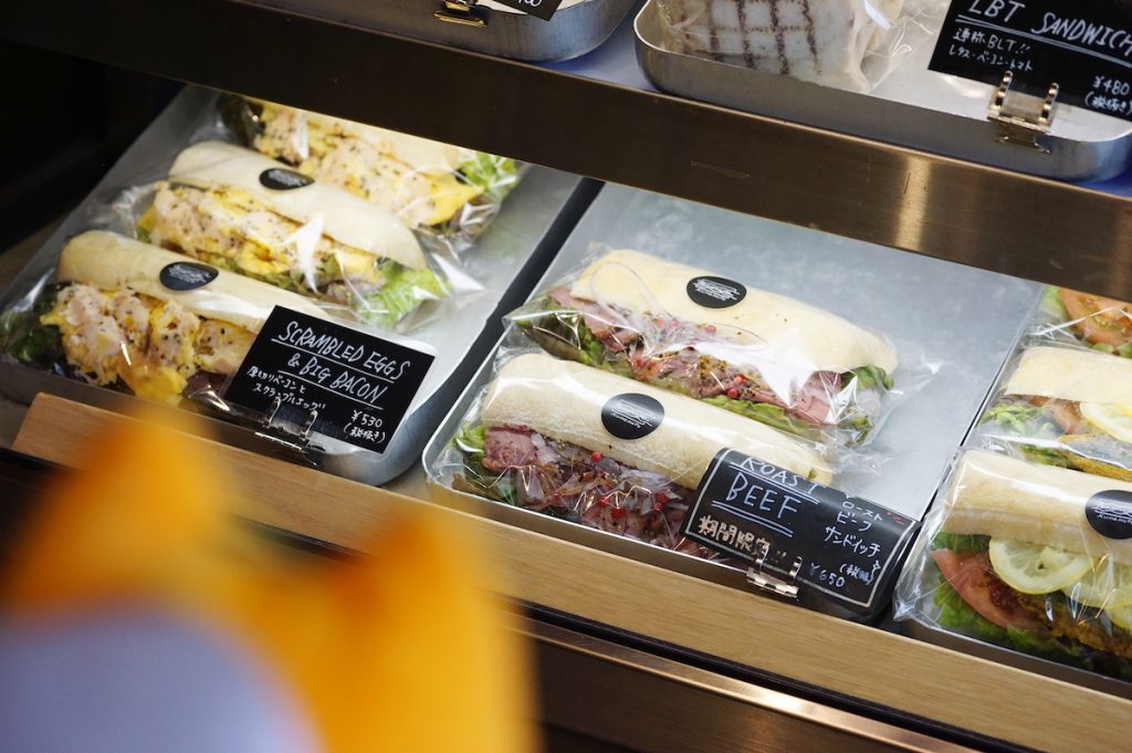 入り口にはサンドイッチのショーケースがあり、厚切りのフルーツサンドにLBTサンド、ビーフサンド、ベーコンとスクランブルエッグサンド、バジルチキンサンド、カレー鯖サンド…などなど目移りしちゃうラインナップ!