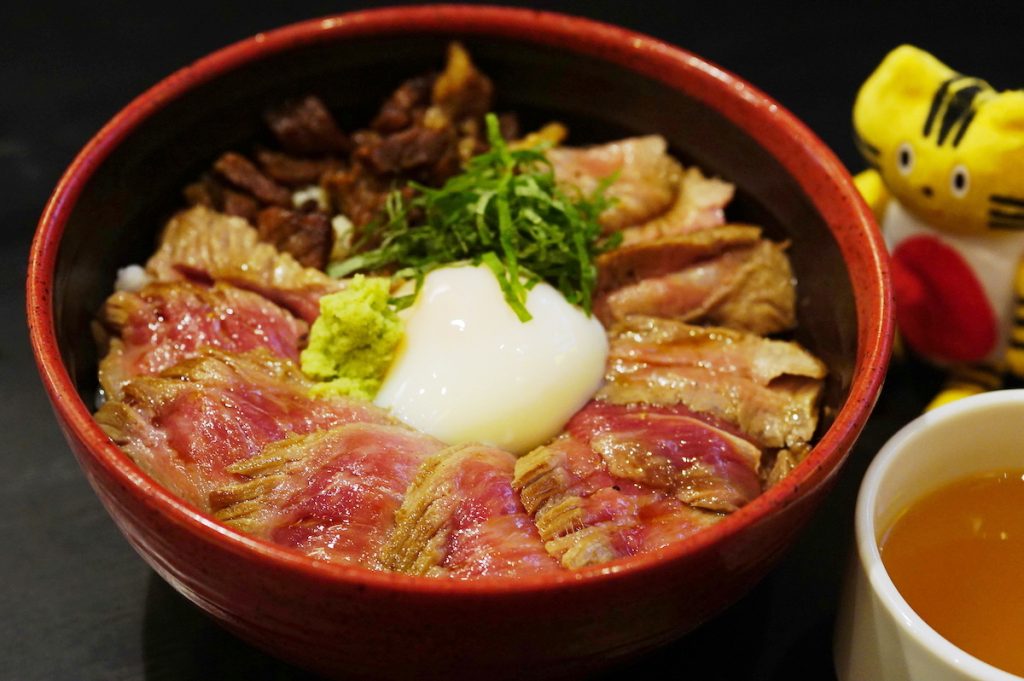 絶品と評されるあか牛をめいっぱい味わいたいなら「あか牛丼」(1800円)を! ミディアムレアに焼かれたあか牛は、驚くほど柔らかく、ニンニク醤油だれとよく絡み、ジューシーな旨味に溢れています。思わず声を上げたくなるほどおいしい〜!! 生姜やニンニクと一緒に長時間煮込んだしぐれ煮も添えられていて、ワサビや青じそ、温泉卵を絡ませながら、いろんな味変を楽しめます。