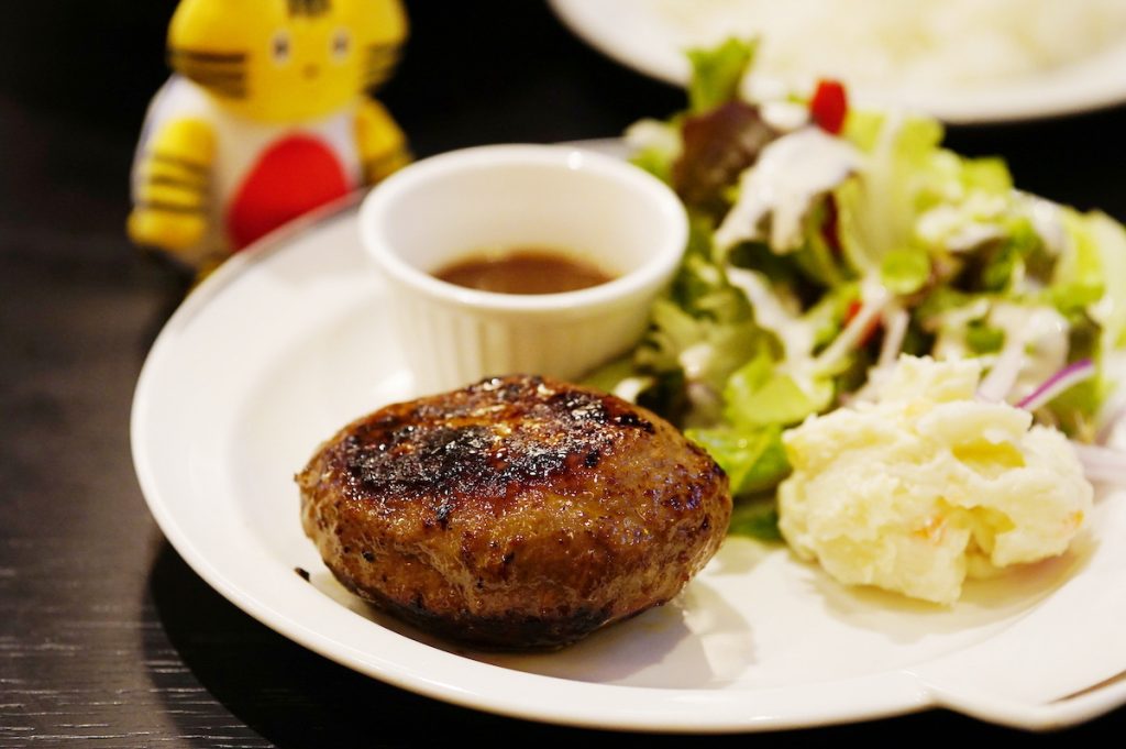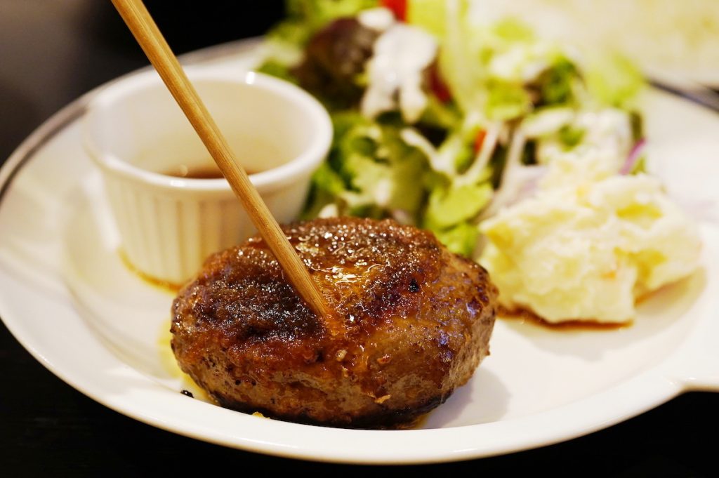 「あか牛ハンバーグ」(1800円)もあか牛100%! お箸を通した瞬間、中から肉汁が溢れ出て思わずゴクリ…。和風のジャポネソースとの相性もバッチリで、柔らかな食感といい、染み渡る旨味といい、このおいしさ、食べてみる価値アリ!