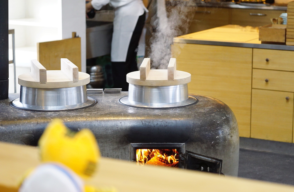 オープンキッチンをチラッと覗くと、かまどから湯気がもくもく。かまどご飯を見た瞬間食欲のスイッチが付いたのか、ふねこのお腹も「ぐぅぅぅ」と空腹のサイン。このかまどは奈良県宇陀市の左官職人が手がけたもので、食堂のスタッフさんが薪をくべながら炊きたてのごはんを提供してくれます。