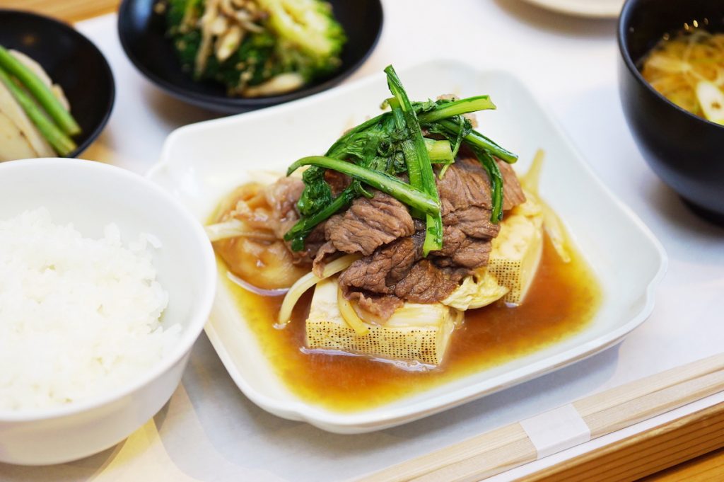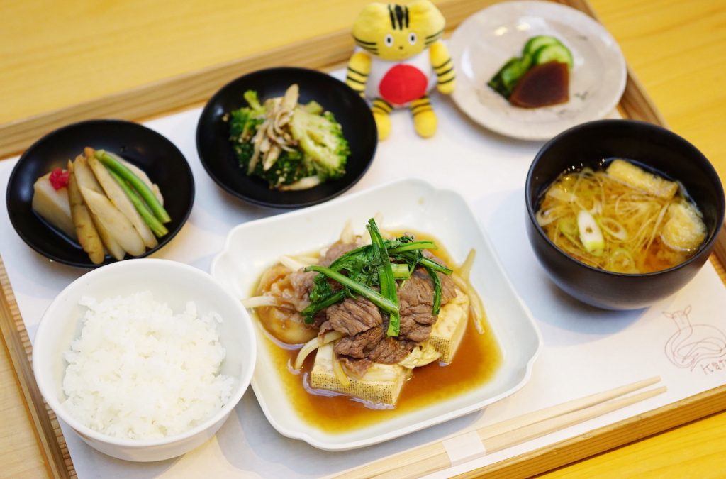 メインの肉豆腐は、奈良のブランド「大和牛」、「奈良近藤豆腐店」の焼き豆腐、なめらかな舌触りともっちり食感が特徴の「大和麩」、地元の新鮮野菜を使って作られた一品。炊きたての白ご飯が進む、旨味たっぷりの味わいです!