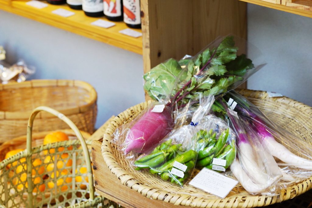 奈良のおいしい恵みをたっぷり味わって満腹のふねこ。お次は併設のグローサリーでご当地食材の物色タイム♪ とれたての新鮮野菜や地元酒造メーカーのお酒、味噌、醤油、パン、無農薬米など、奈良自慢のからだに優しい食材が幅広く揃います。