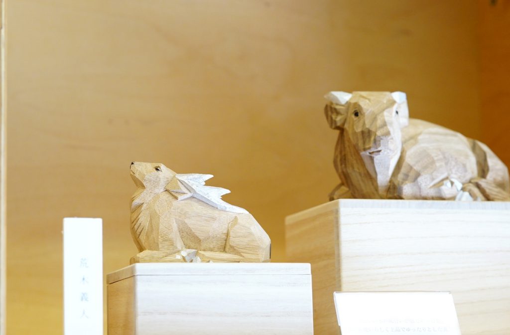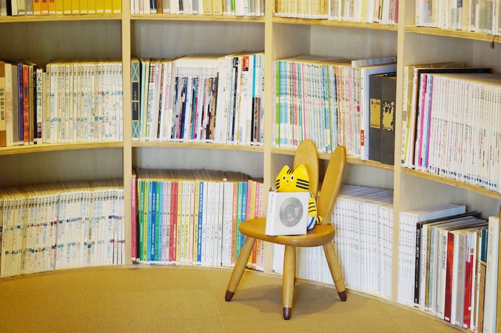 楕円形の書庫には1000冊を超える書籍がズラリ! 奈良の伝統文化や観光、民芸、食など、地域にまつわる本がたくさん並んでいます。ふねこは奈良の器の歴史について学んでいる様子。奈良時代の食器はどんなデザインだったのでしょう? 食いしん坊の好奇心がかきたてられますね♪
