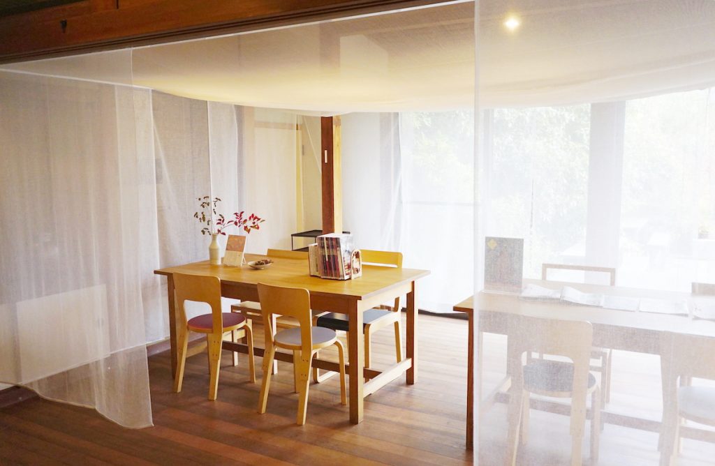 奈良時代から続く蚊帳文化を表す図書スペースは、本を読んだり調べものをしたり誰でも自由に利用できます。木漏れ日が差す柔らかな空間に、心がふっくら和むふねこ。気持ちよくてついつい長居しちゃいますね…!