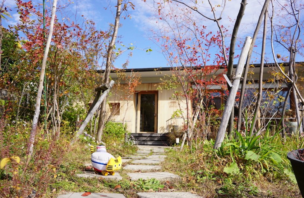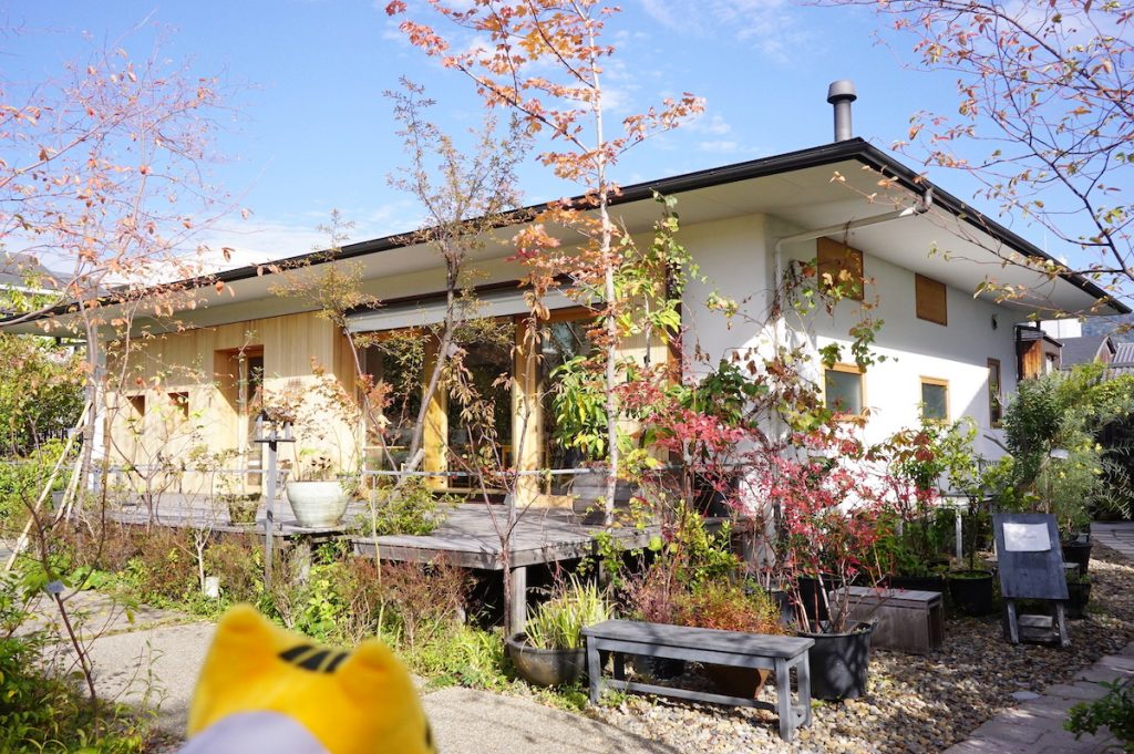 敷地の奥に進むと、草花や木々たちに寄り添うように佇むナチュラルテイストの建物が見えました。ここはレストラン&喫茶室の『囀-saezuri-』です。森の中で深呼吸するようなオアシス的空間を見つけ、ふねこも思いっきりリラックス♪
