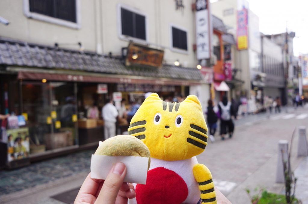 よもぎ餅一筋、大将の中谷さんと記念撮影をパシャり。あれれ? ふねこのお腹もよもぎ餅みたいにプニプニしてきたみたい…!?