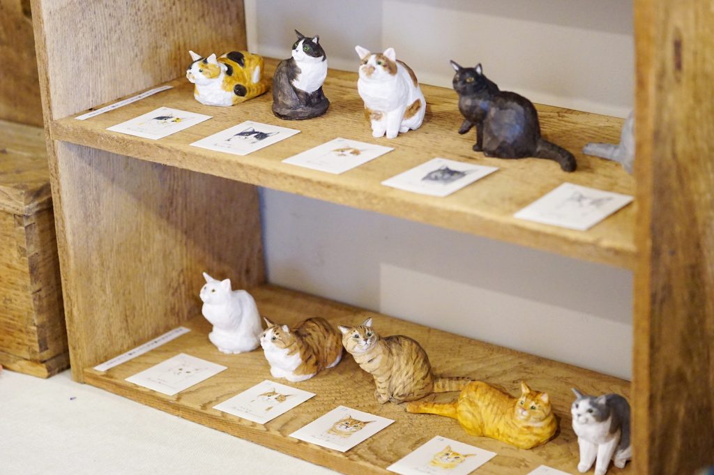 今にも動き出しそうな手のひらサイズのねこのオブジェは、木彫り作家〈バンナイリョウジ〉さんの作品。独特の表情や仕草をとらえていて、目を逸らすことができませんね…!!