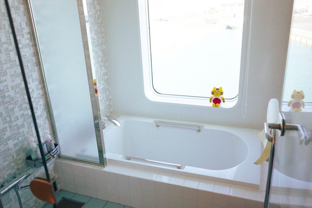バスルームは大きな窓付き。大海原を眺めながらお風呂に浸かれますよ。洗面化粧台も高級ホテルさながらのリッチな佇まいで最高…!