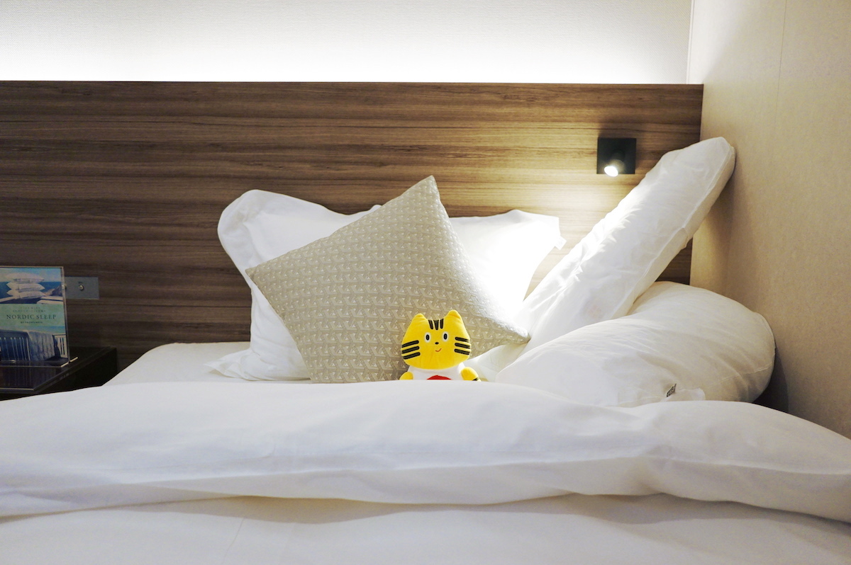 さっそくふねこ、ベッドの寝心地をチェ〜ック! 一度寝転がるともう起き上がりたくなくなるほど、ふっくら柔らかな温もりに包み込まれます。それもそのはず! 「ロイヤル」のベッドは、〈NORDIC SLEEP(ノルディックスリープ)〉というデンマークの寝具ブランドを使用し、北欧流の上質な眠りを提供しています。