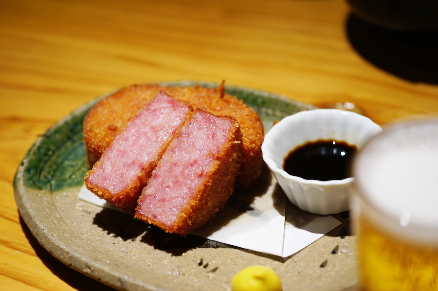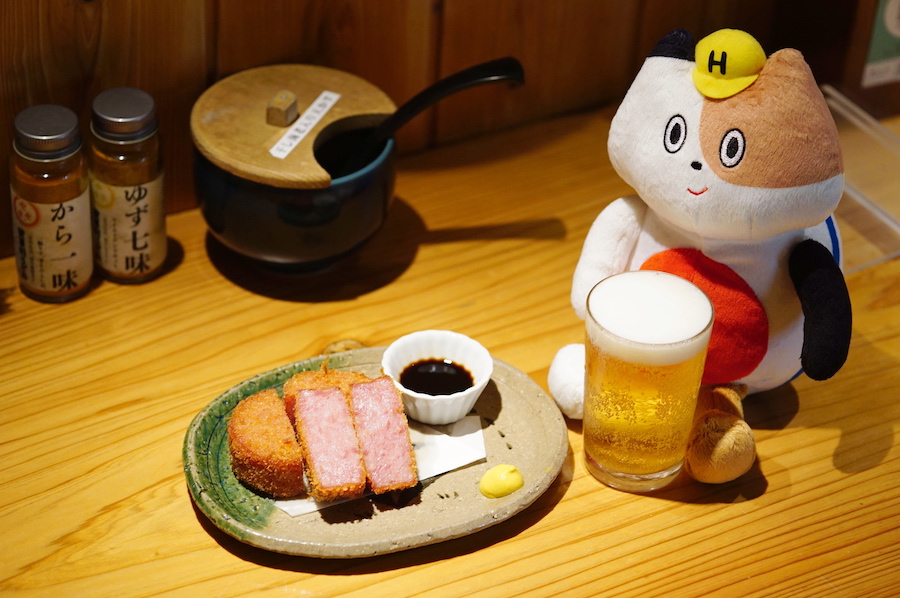 お酒のおつまみには「雲仙ハムカツ」(605円)がおすすめ。これは『二○加屋 長介』でも人気の一品で、カリッとした薄衣の食感とジューシーな雲仙ハムの味わいがビールに合います! 他にも「かつを酒盗」や「トリュフフライドポテト」など酒好きのツボを押さえたメニューが充実。