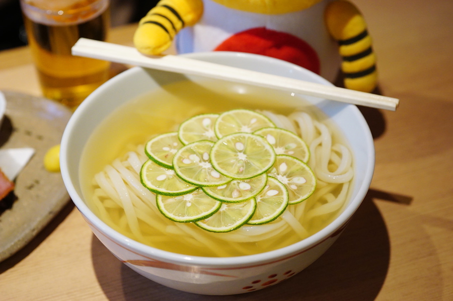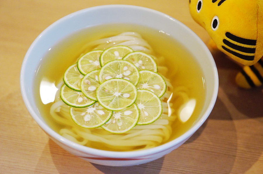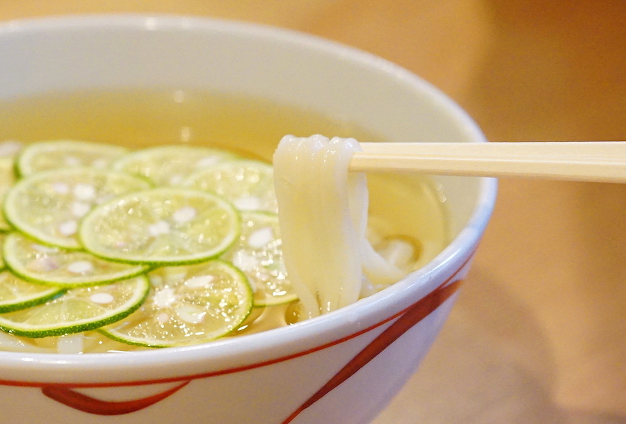 〆のうどんに選んだのは、名物の「すだちかけうどん」(770円 ※1〜5月は+100円)。輪切りしたすだちの盛り付けがおしゃれで、香り高いすだちの爽やかな酸味は一度味わったら忘れられない新感覚の味わい。きらきらと澄み渡るスープの透明感も美しい〜! 「すだちかけうどん」は冷たいスープで味わうのが醍醐味。
