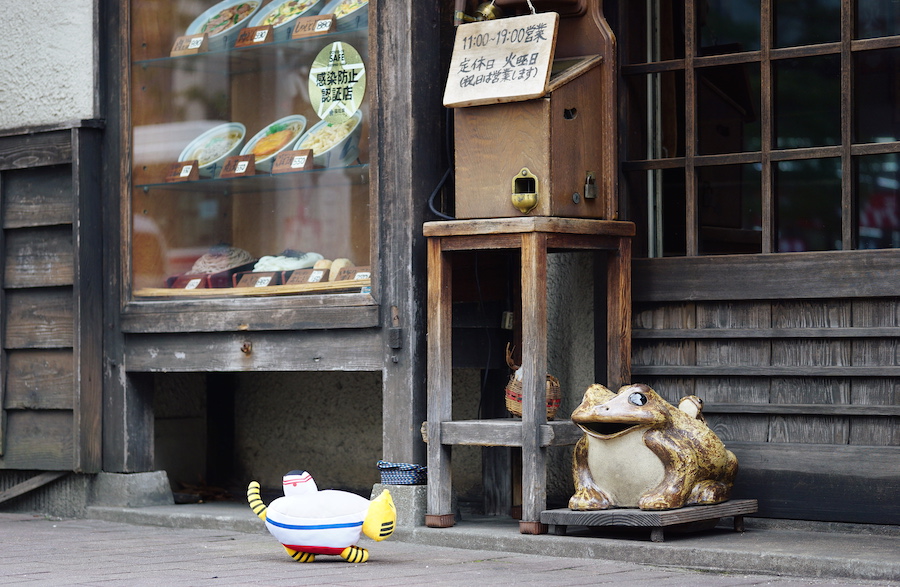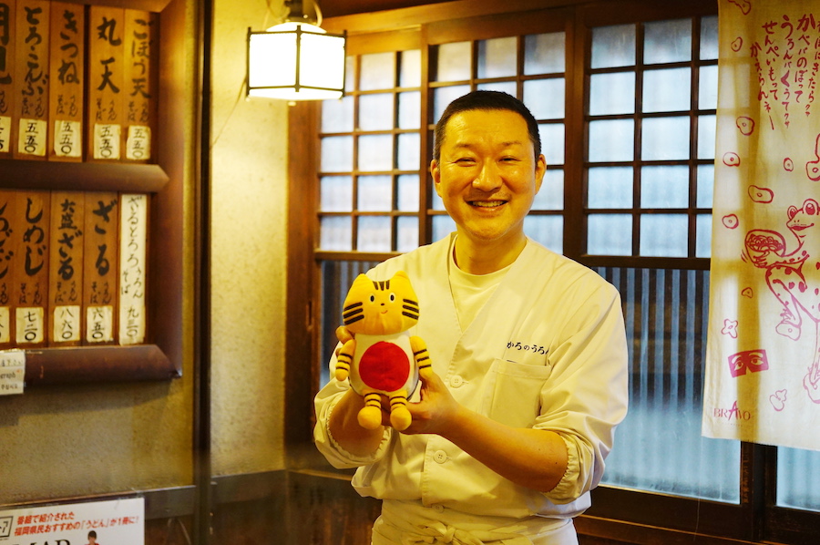創業当時は「角のうどん」と呼ばれ、それが博多弁の訛りで「かろのうろん」となったそうです。軒先にはトレードマークのかえるさんがお出迎え。ふねこもペコリと挨拶をしながら入店します♪