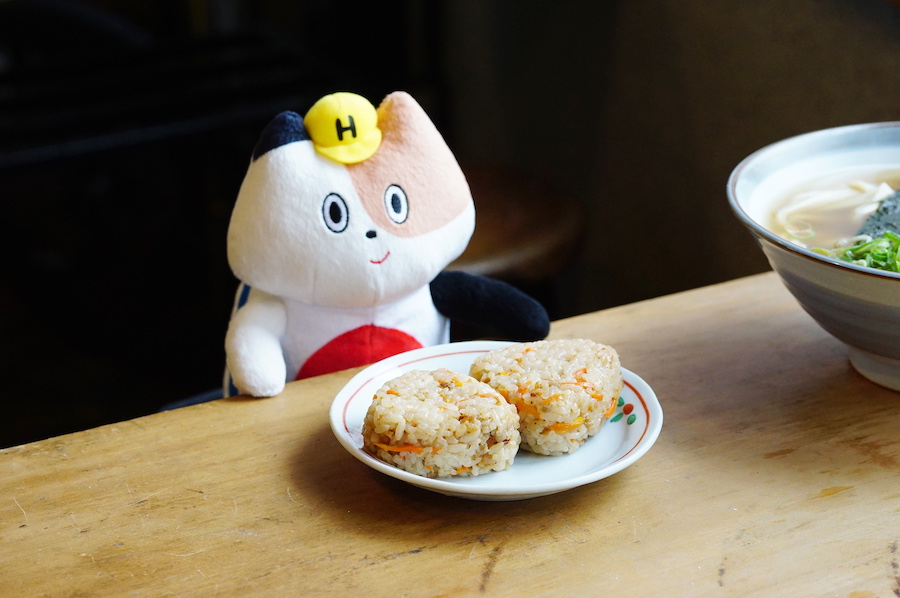 そして、博多うどんのお供「かしわおにぎり」(鶏肉の炊き込みご飯のおにぎり)も欠かせません! なんだか、みけやんの左耳の色みに似ていますね♪