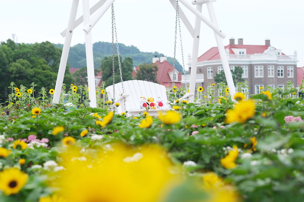 木造の三連風車が並び、季節の花々が咲き誇る「フラワーロード」は、まるでヨーロッパの田園風景のよう…! 8月〜9月上旬まではミニひまわりのサンビリーバブルをはじめ、花びらが星のような形をしたペンタス、緑や赤などカラフルな葉をつけたアキランサスが見頃。お花畑でブランコに揺られ、メルヘンチックな写真が撮れました♡