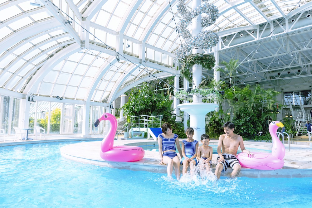 園内では9月9日(金)までリゾートプールも楽しめちゃいます! 高さ約10mのメガスライダーが目玉の「ガーデンプール」(屋外)と、のんびりプール遊びができる「森のプール」(屋内)の2つのエリアがあり、ハウステンボスでも夏の水遊びを満喫できます。※森のプールはパスポート対象外