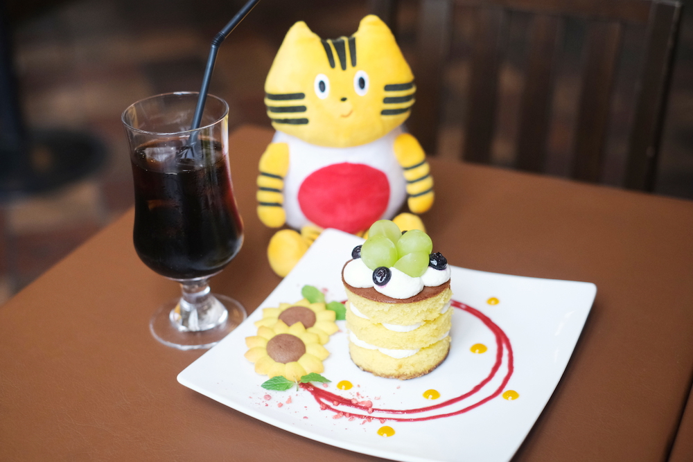 遊びまわって小腹が空いたら、夏のスペシャルスイーツをどうぞ♪ ふねこたちは、長崎生まれのトルコライスを味わえる洋食店『とっとっと』で、夏季限定の「長崎かすてぃらケーキ〜ハウステンボス産ブルーベリーを添えて〜」をオーダー! カステラのデコレーションや飾りのクッキーがハウステンボスのひまわり畑とリンクしますね♪ やさしい甘味に、遊び疲れたカラダがほっと癒されました。
