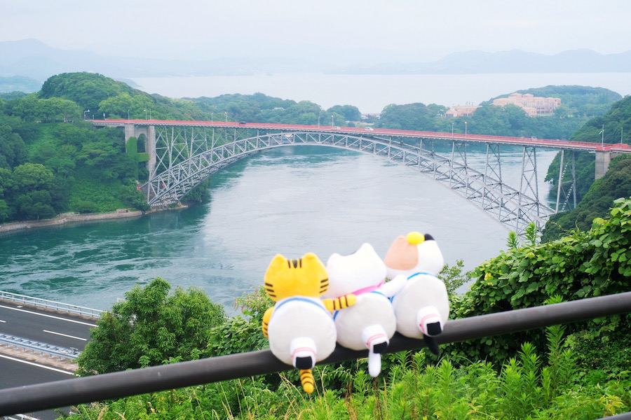 ここは佐世保市と西彼半島をつなぐアーチ式の橋で、春は桜の名所として知られますが、日本三大急潮のひとつに数えられる針尾瀬戸の急流と豪快なうず潮も見ものなんですよ!