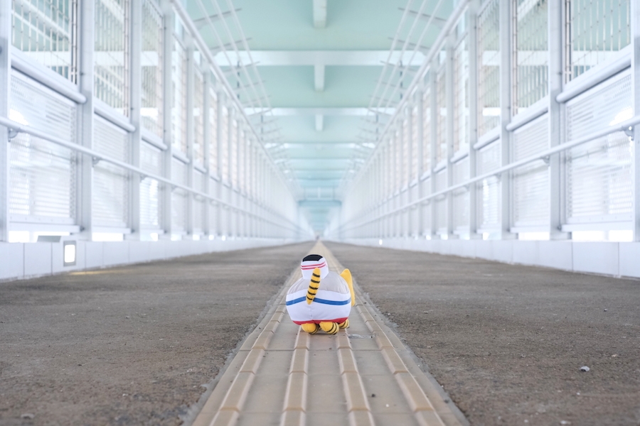 歩道橋中央スペースの床にあるガラス張りの窓にも注目を! 橋の上から真下のうず潮を見ることができ、ちょっとしたスリルも味わえます。ふねこも足が震えてる…!??