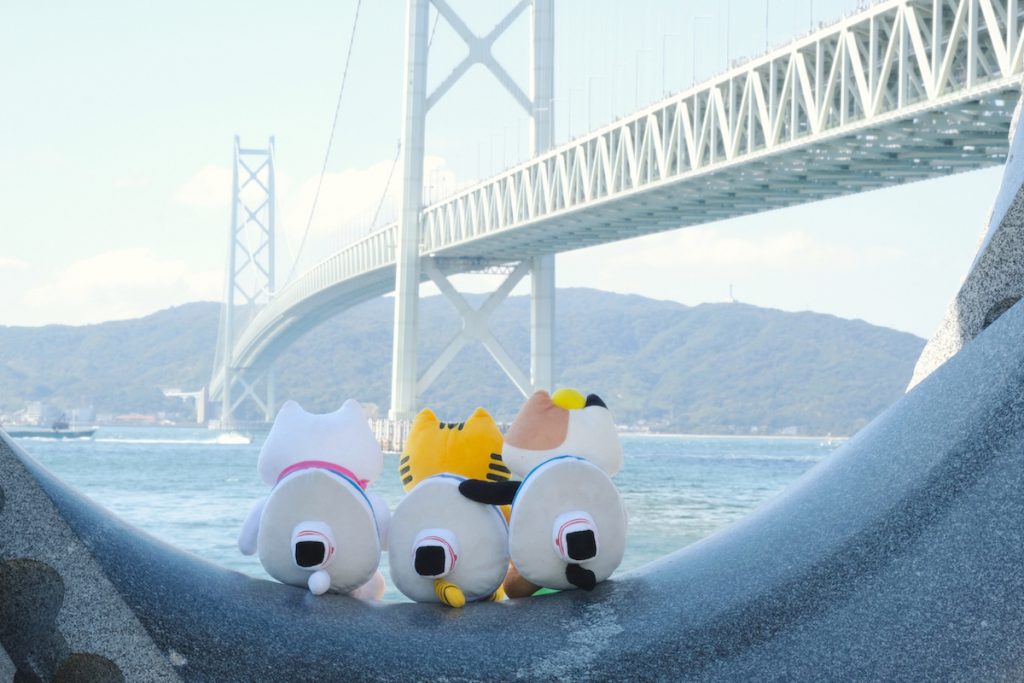 公園内にある記念碑「夢レンズ」から明石海峡を眺めるふねこたち。
