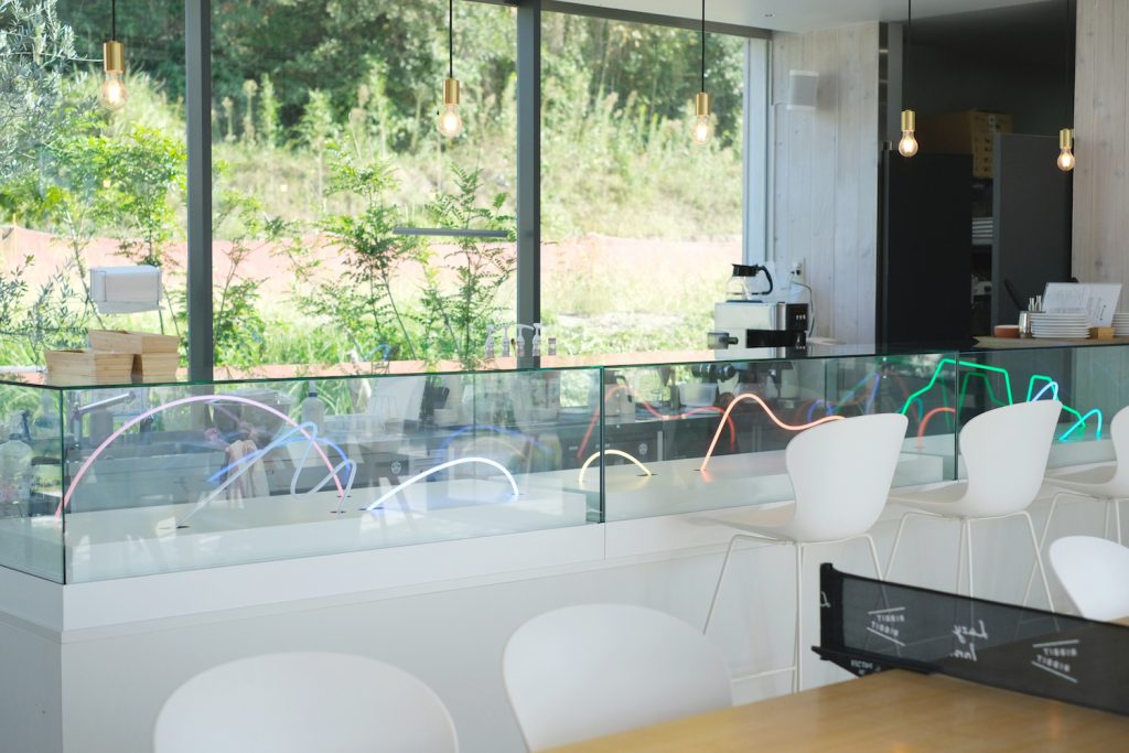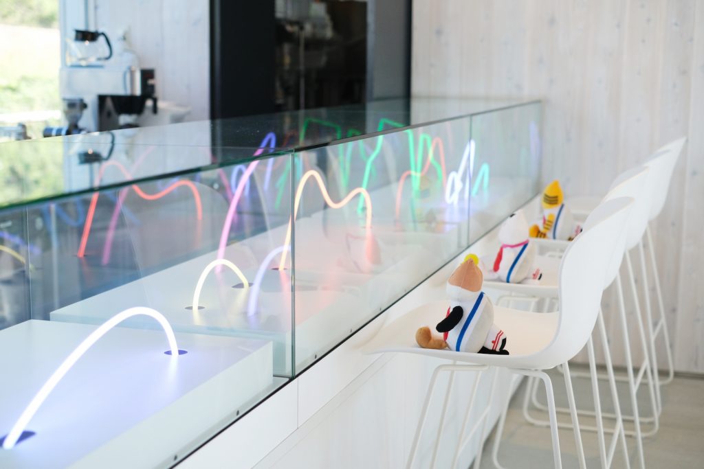 チェックイン等のフロントを兼ねたカフェもおしゃれ☆ ふねこたちの後ろでは、淡路の食材をふんだんに使ったガレットやデザートクレープを楽しむ観光客もいて、そのメニューもフォトジェニックでおいしそうでした…!