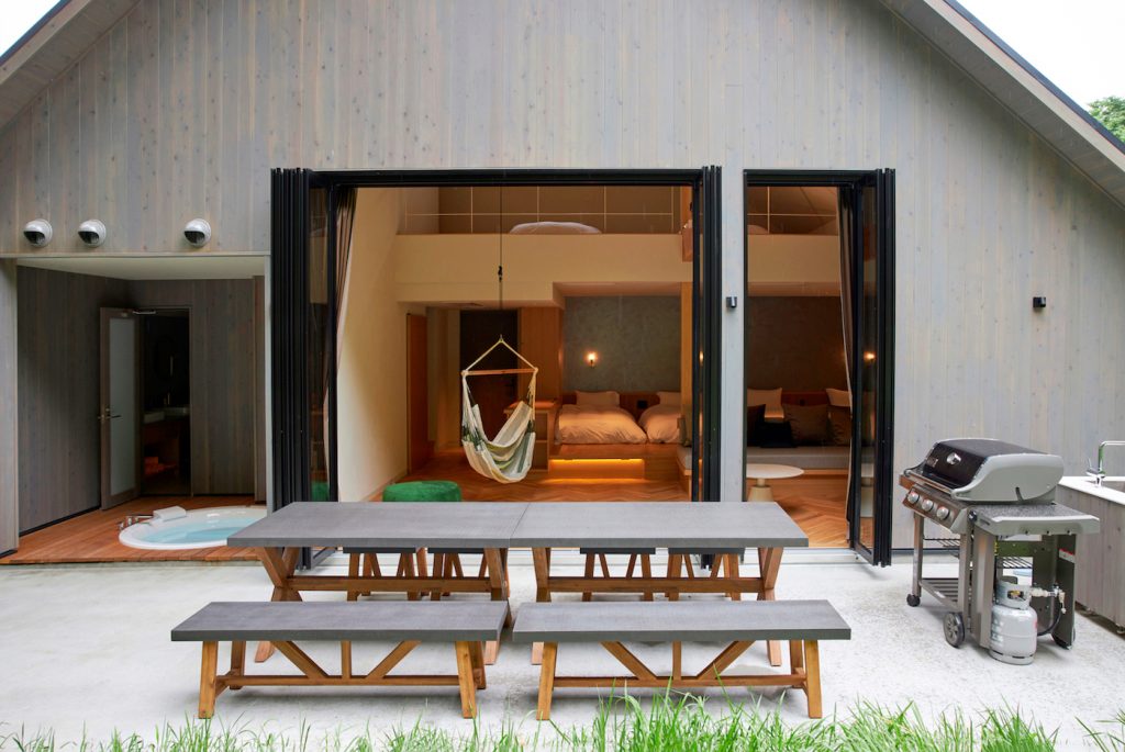 リビングにハンモックや広めのソファがあり、テラスにはBBQグリルとテーブル席も完備。さらに屋根付きのアウトバスも! 夜空を見上げながら、そして爽やかな風を感じながら、ゆったりと湯船に浸かることができるなんて贅沢です〜!