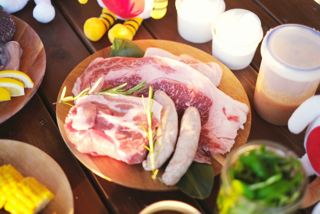 まずはお肉! デデ〜ンと大きな淡路牛と淡路ポーク、淡路産えびすもち豚ソーセージ、国産鶏もも肉。