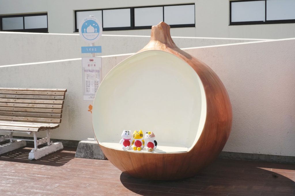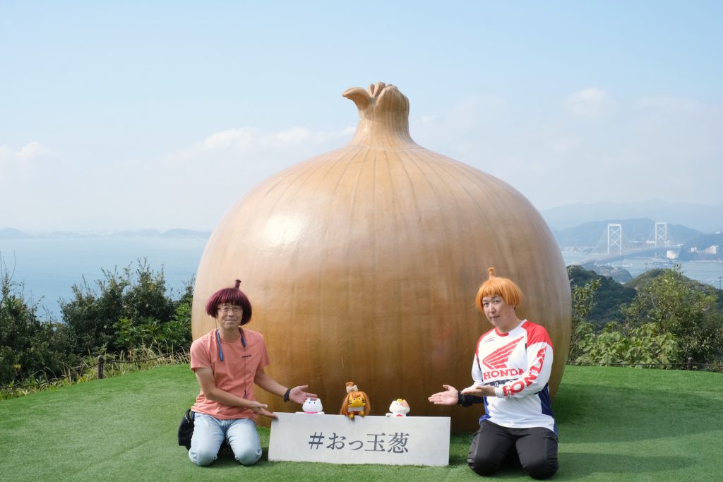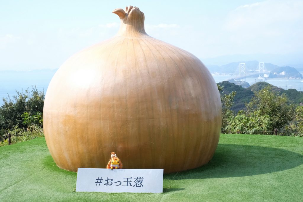 淡路島といえば、玉ねぎの名産地ということで、展望スペースに玉ねぎのオブジェ「おっ玉葱」が鎮座し、フォトスポットになっているのです。ふねこの頭ををよ〜く見てください。わぉ! 玉ねぎヘアー!!