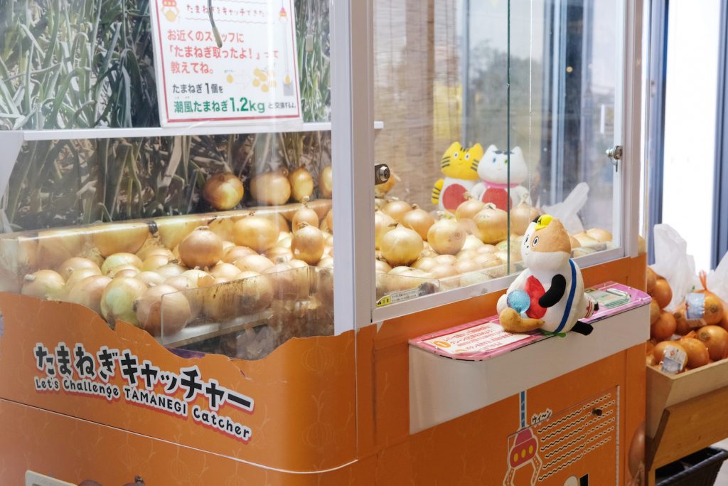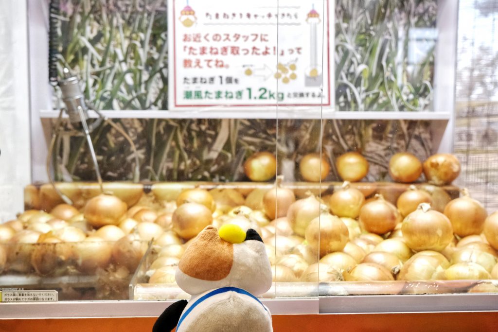 マシーンの中に淡路産の玉ねぎがゴロゴロ入っているので、そこから一個キャッチできたら玉ねぎ1袋分(1.2kg相当)と交換できるそう。真剣のまなざしのみけやん…! 見事ゲットできたらスタッフの方がベルをチリンチリンと鳴らしてくれて、周りのお客さんも祝福もしてくれて嬉しさ倍増★