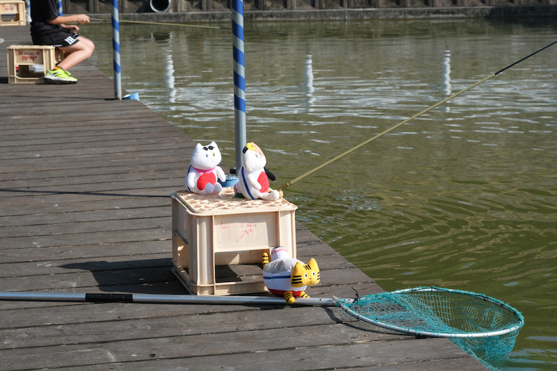 釣りエサ&レンタル道具をゲットしたふねこたち。案内・管理役のスタッフさんから釣り竿のセッティングや釣りのポイントを教わりながら、遊歩道の両側に備えられた釣り台で「サビキ釣り」にチャレンジ!