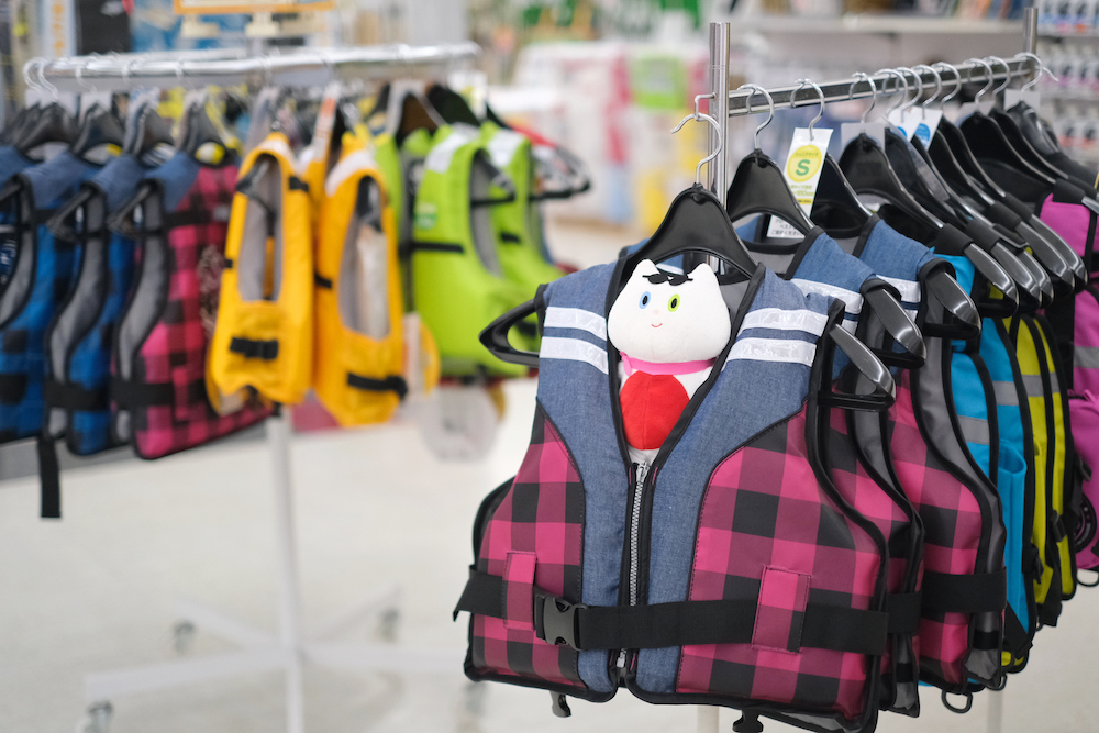 キッズ用のライフジャケットもおしゃれ! せつこにはちょっと大きいかな〜・・・。