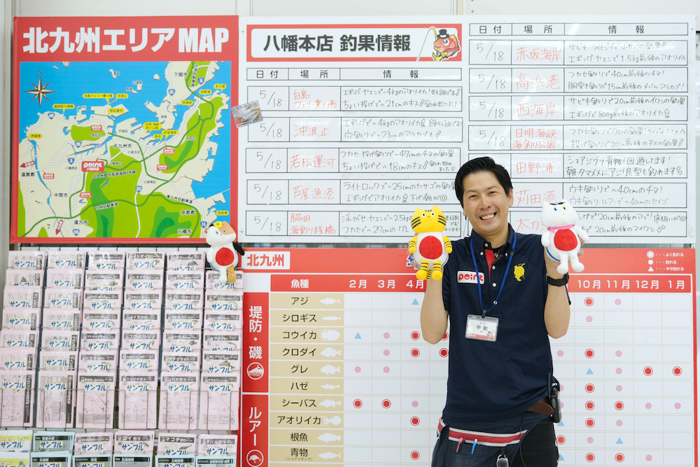 「釣りたい魚がどの釣り場で釣れるかリサーチしたり、これから行く予定の釣り場の釣果情報を確認したり、北九州の釣り情報をまとめているのでぜひこの掲示版もチェックしてください!」と店長の甲斐さん 。北九州エリアの8店舗のスタッフと情報共有し、近郊の釣果情報をリアルタイムで発信しているそうです。